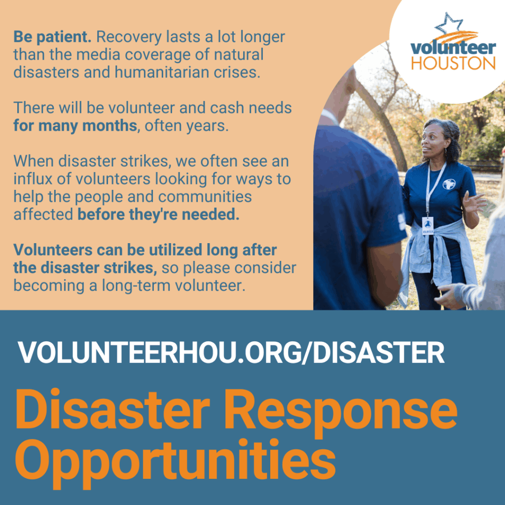 After a disaster, Volunteer Houston sets up virtual Volunteer Reception Centers (VRC’s) to match volunteers with urgent volunteer needs in the community.
